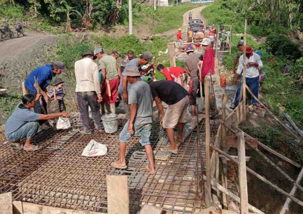 Gotong royong terlihat begitu kuat saat warga dan prajurit TNI bahu membahu membawa serta menuangkan material coran ke struktur jembatan yang telah disiapkan. Aktivitas ini menjadi salah satu bentuk nyata sinergi antara masyarakat dan TNI dalam membangun infrastruktur desa yang lebih baik.