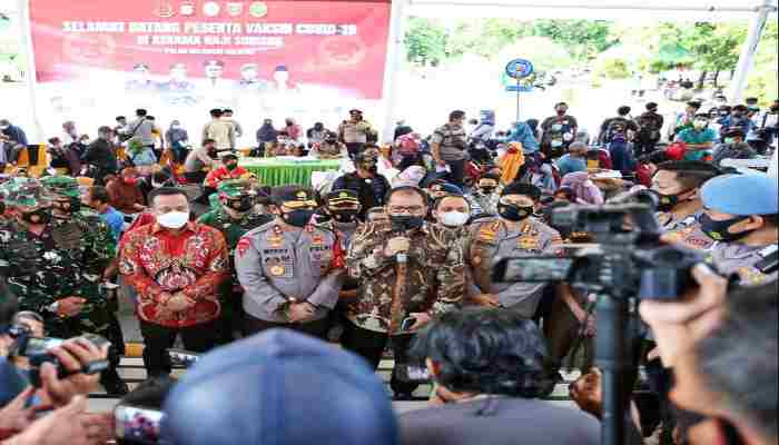 Pantauan peliput, Kapolda Sulsel Irjen Pol Merdisyam bersama Plt Gubernur Sulsel Andi Sudirman Sulaeman dan Kasdam XIV Hasanuddin didampingi Wakapolda Sulsel Brigjen Pol Drs.Halim Pagarra , Walikota Makassar Ramdhan Pomanto, Kabid humas Polda Sulsel Kombes E Zulpan dan beberapa PJU Polda Sulsel lainnya meninjau langsung kegiatan vaksinasi massal tersebut, mulai dari tahap pendaftaran, penyuntikan hingga observasi pasca-vaksin diselenggarakan di Gedung Utama Asrama haji sudiang Makassar, Sabtu (26/6/2021).