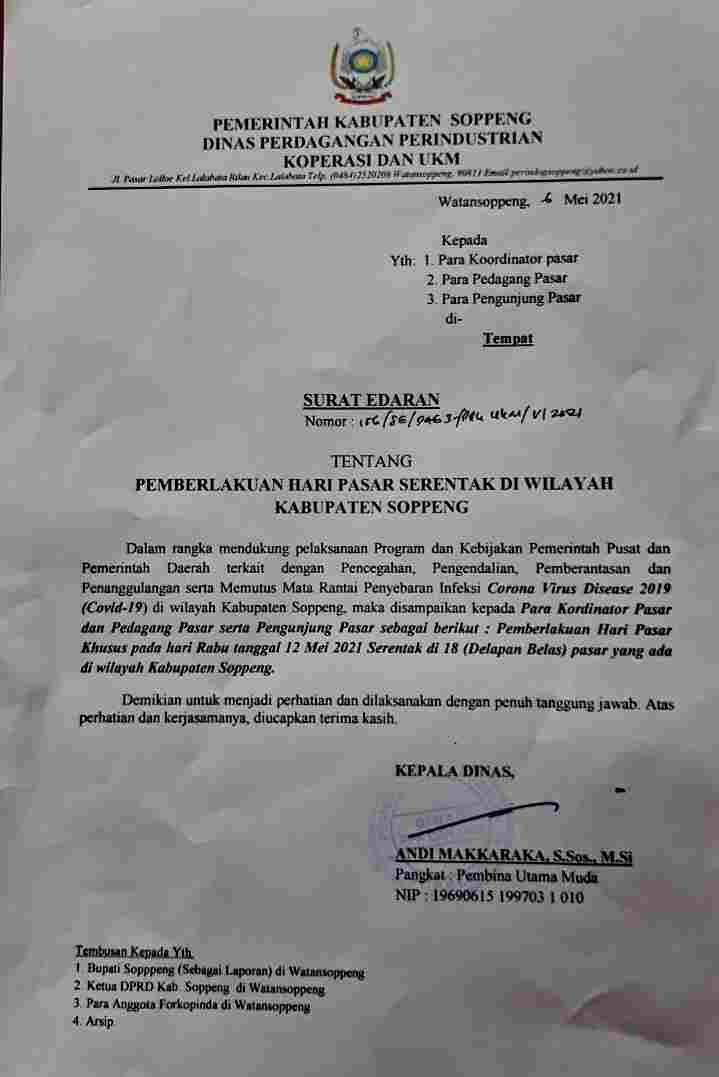 Surat edaran yang ditanda tangani oleh Kepala Dinas Koperindag, Andi Makkaraka ditujukan kepada para kordinator pasar, pedagang pasar, dan pengunjung pasar, tentang pemberlakuan hari pasar serentak di wilayah Kabupaten Soppeng.