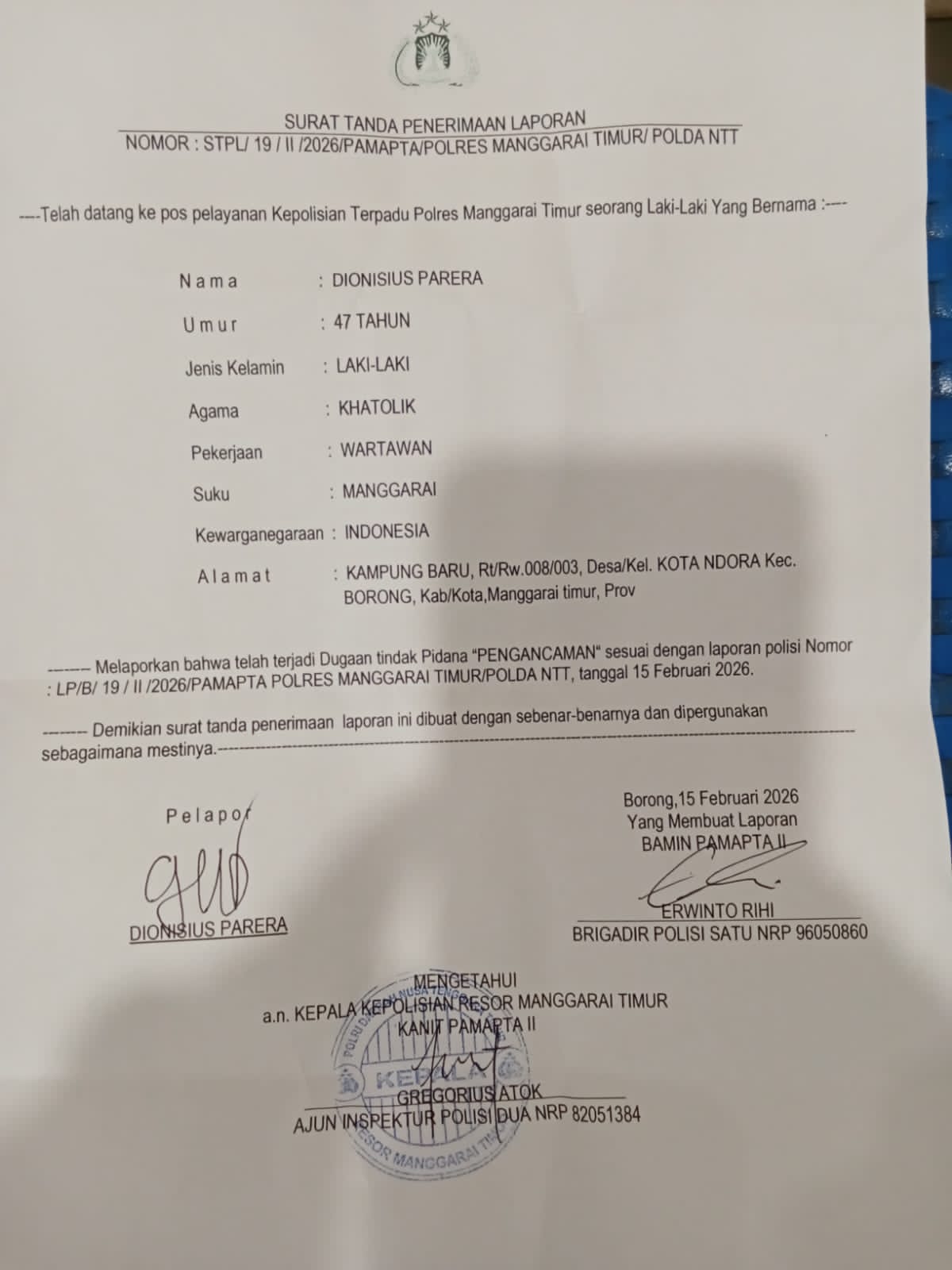 Laporan pengaduan tercatat pada hari ini, 15 Februari 2026, dan diterima oleh Petugas SPKT Resmatim, Brigadir Polisi Satu Erwinto Rihi, dengan nomor laporan LP/B/19/2026/PAMAPTA POLRES MANGGARAI TIMUR NTT. Pernyataan pelapor dan rangkaian pesan singkat yang menjadi dasar laporan disampaikan kepada polisi sebagai bukti awal.