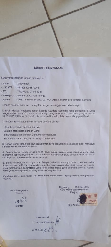 Siti Aminah menegaskan pula bahwa tidak ada hubungan jual beli antara dirinya dengan saudara Budi Husen alias Uba. Mengenai dokumen yang sempat ditandatanganinya di rumah Budi Husen, Siti menjelaskan bahwa penandatanganan itu bukan dilakukan di tempat atau di atas tanah milik Kepala Desa Syarifuddin. “Surat yang saya tanda tangan di rumahnya Budi Husen alias Uba itu bukan di tempat atau tanah miliknya Kades Syarifuddin,” tuturnya.