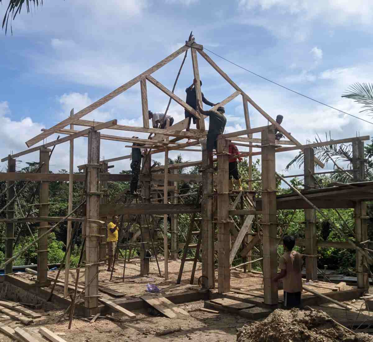 Program RTLH Satgas TMMD ke 124 Kodim 1431/Bombana, Pasang Ring Balok dan Kuda-Kuda Rumah Ibu Hasneni
