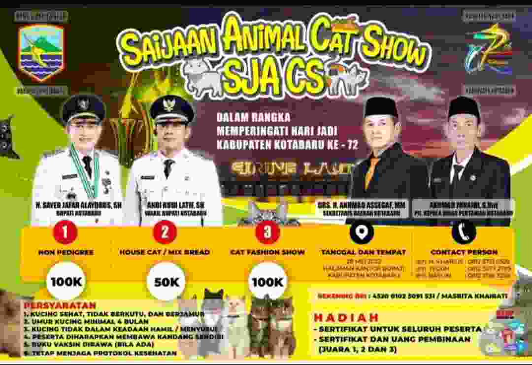 RadarTipikor.Com – Dalam rangka memperingati Hari Jadi Kotabaru ke 72 dan memeriahkan Saijaan Expo Kotabaru 2022, Dinas Pertanian mengadakan Lomba Saijaan Animal Cat Show di eks lapangan basket Setda Kotabaru. Sabtu, 28 Mei 2022